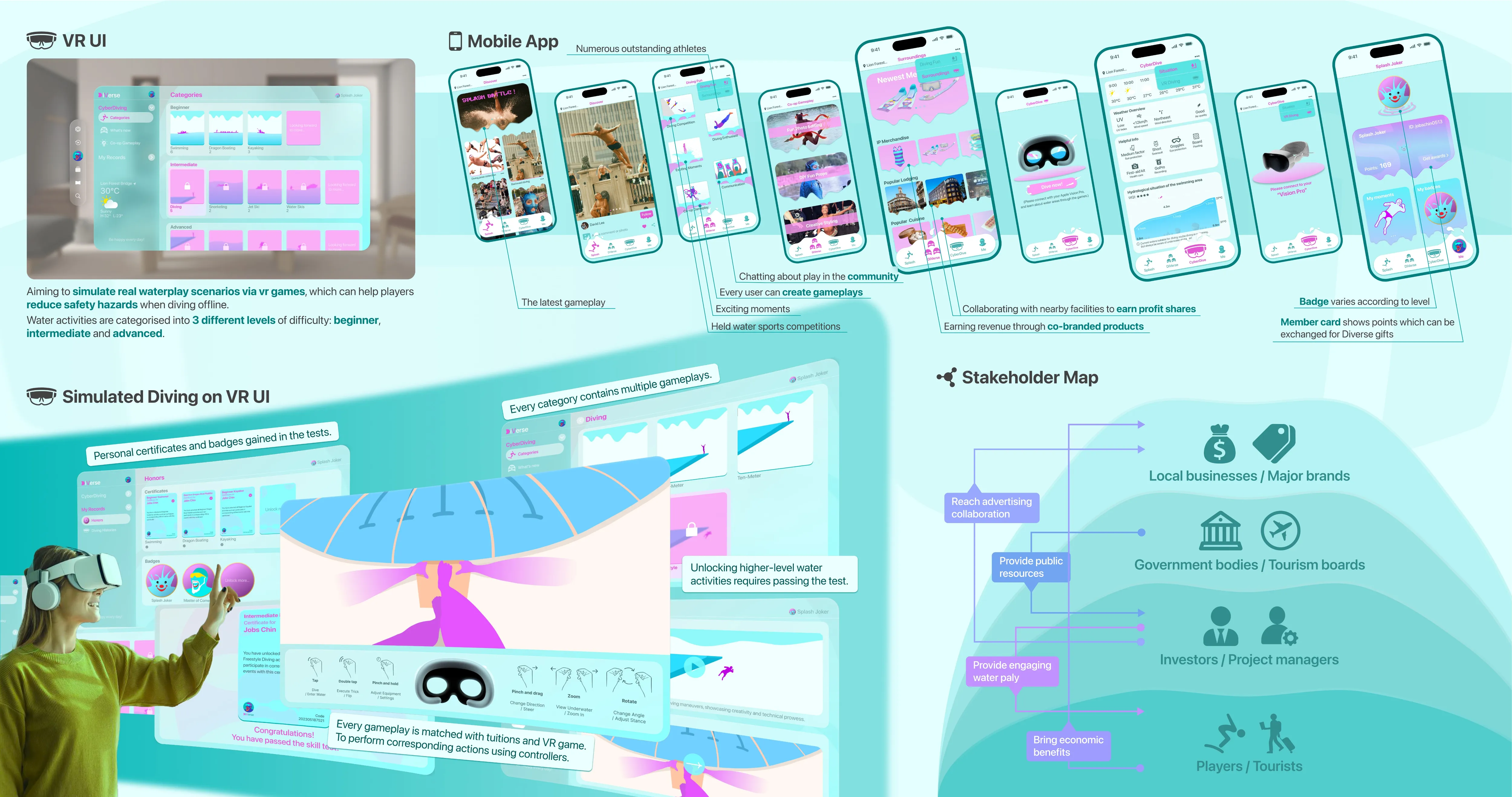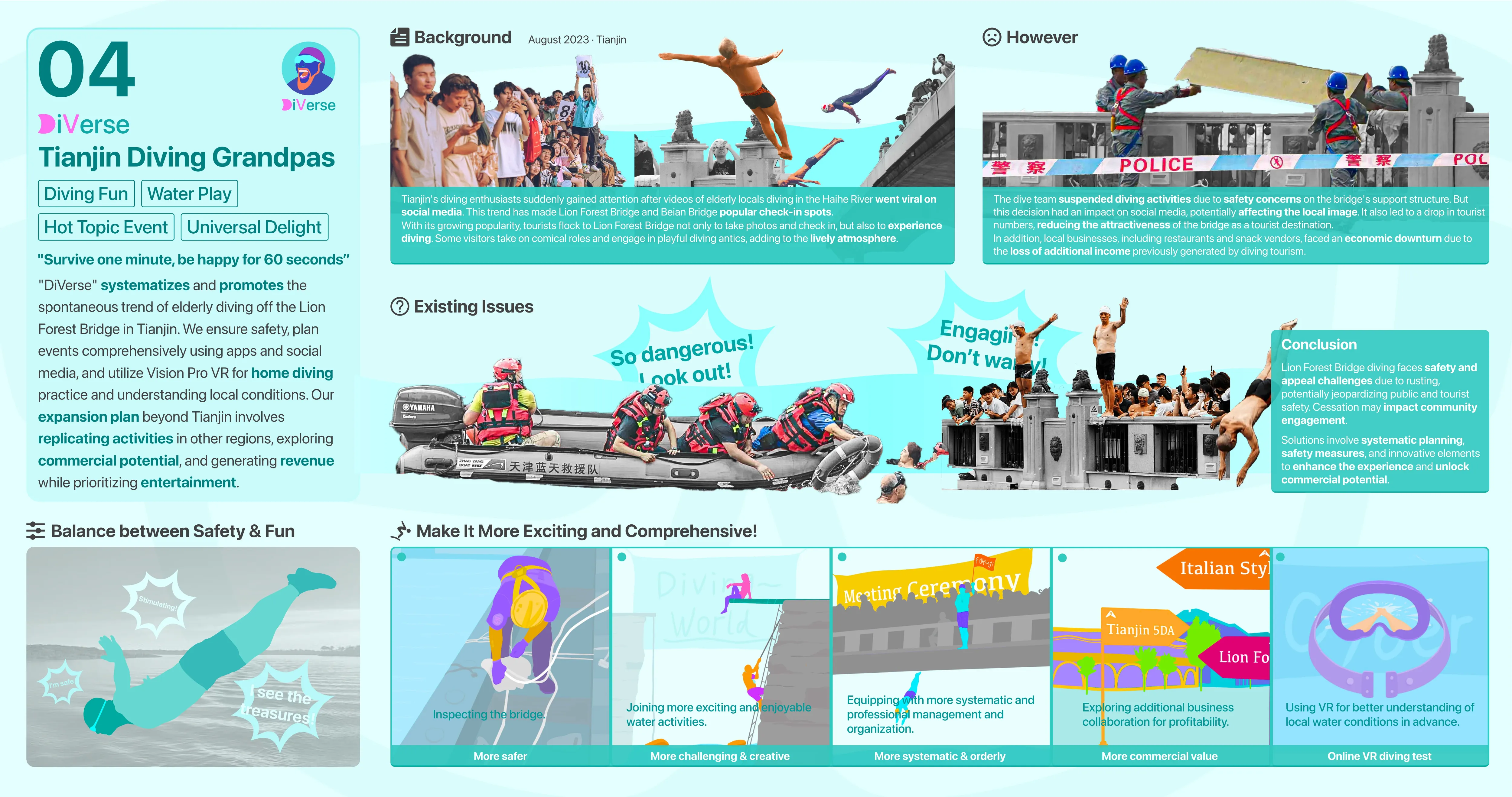 以天津 “跳水爷爷” 城市热点为切入点,针对自发活动存在的安全隐患、秩序混乱及短期热度难持续等文旅痛点,运用服务设计与数字化手段,将民间现象转化为规范化城市文旅 IP;通过打造品牌视觉体系、开发整合 VR 训练与社区互动的数字化平台、升级线下安全游乐场景,联动政府、商家与用户多方协同,构建 “IP 化 + 虚实融合 + 可持续运营” 的城市文旅新模式,既保障公共安全与居民利益,又激活城市消费、打造特色文旅名片,为城市突发热点转化为长效经济与文化价值提供可复制的创新范式。