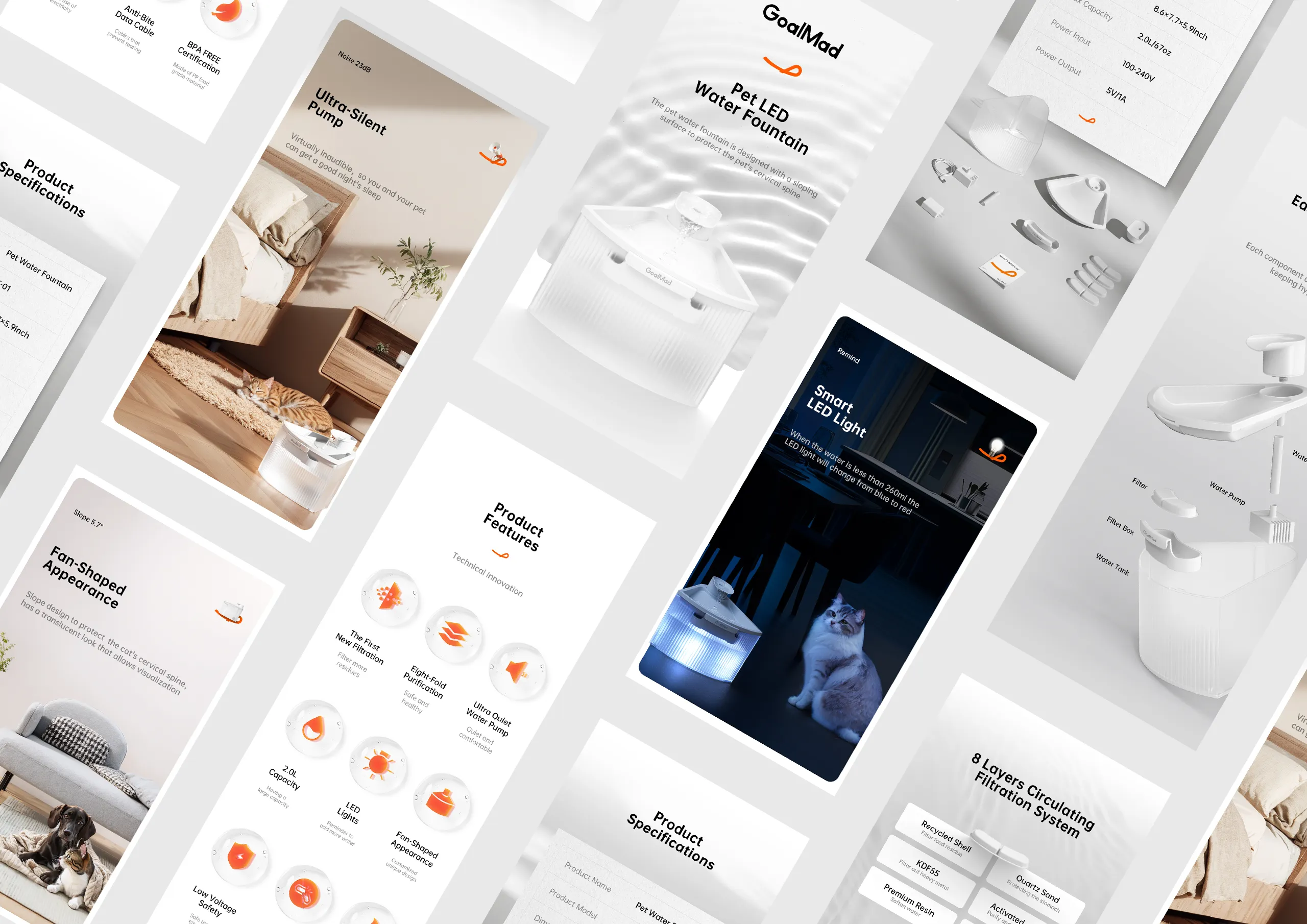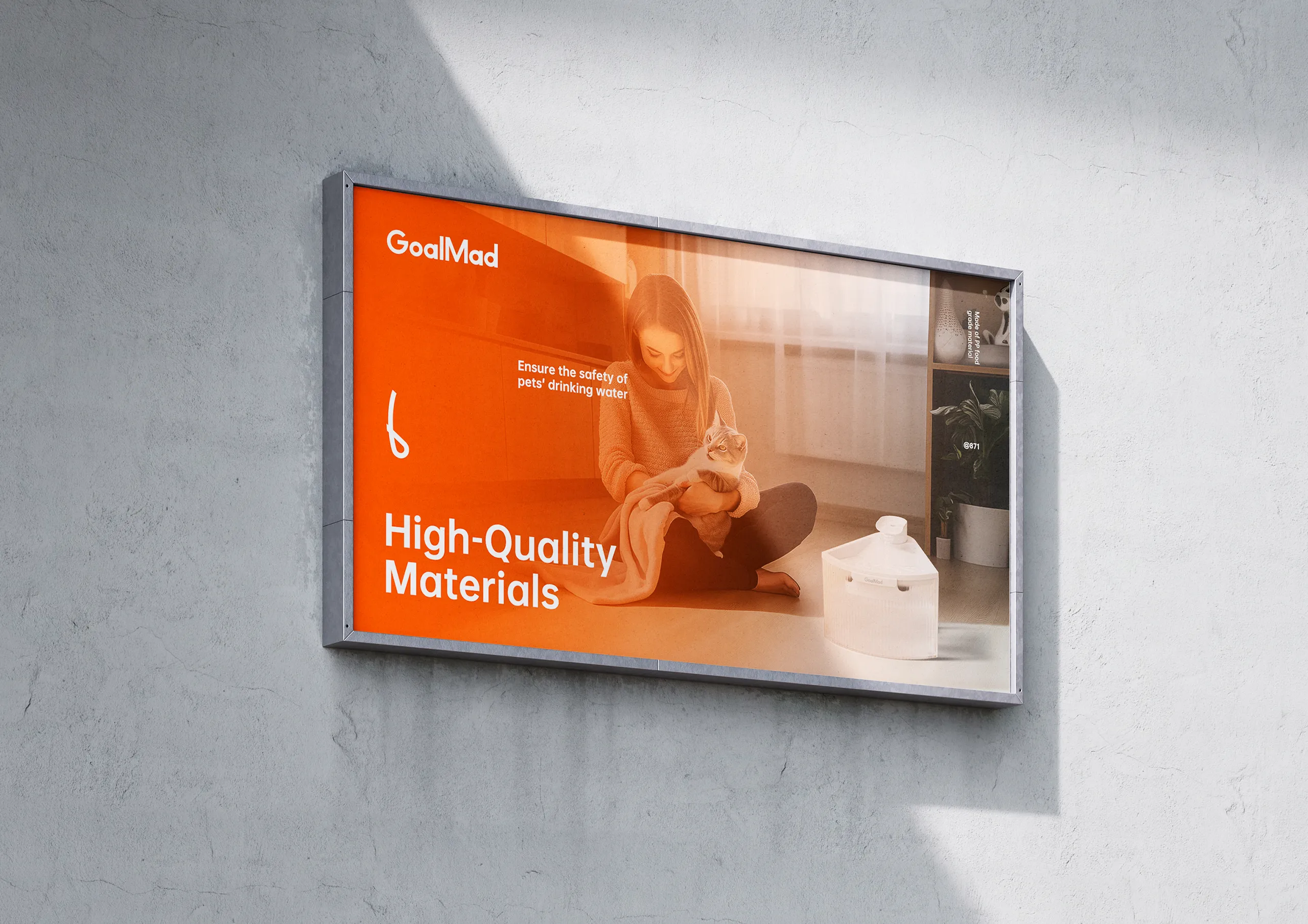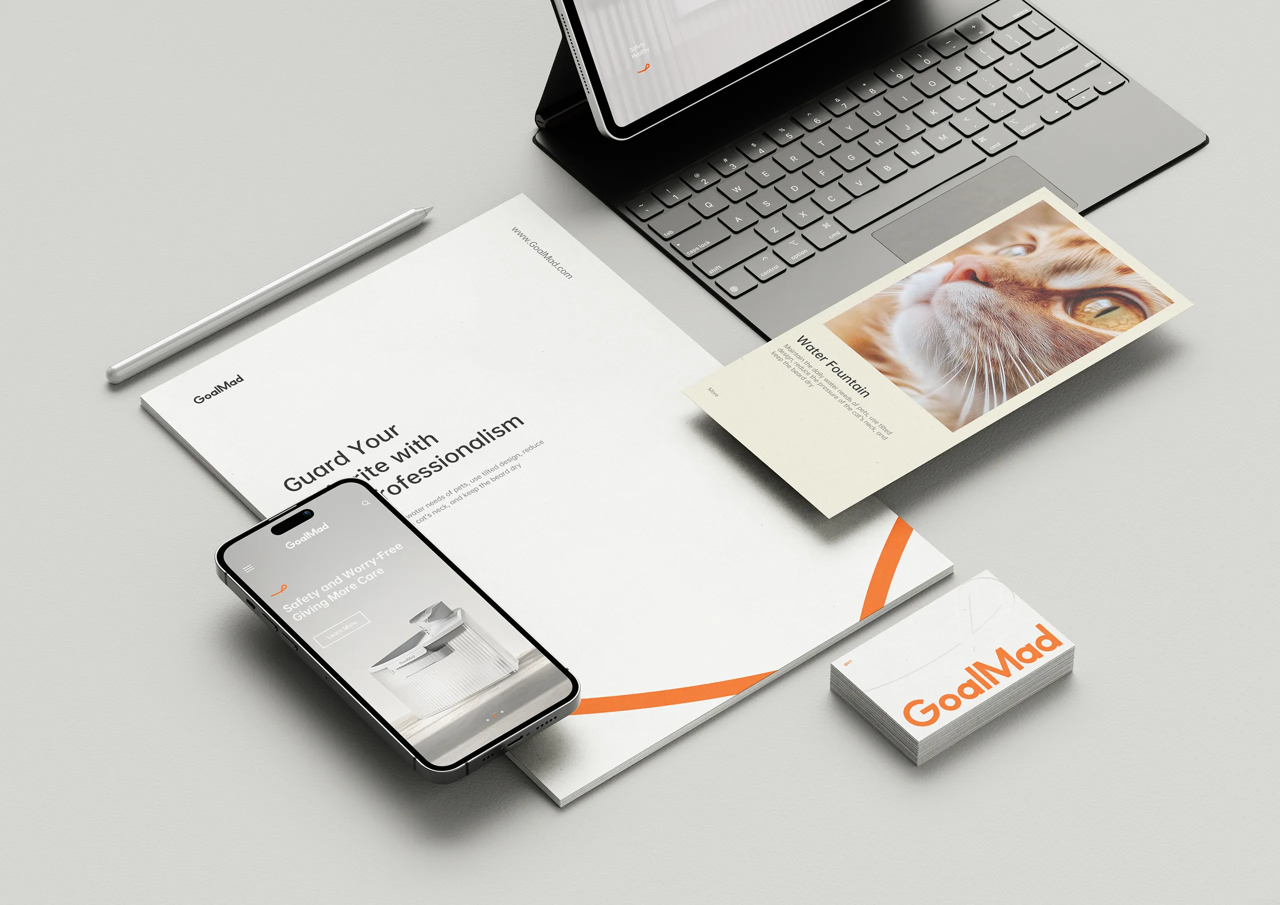 GoalMad 致力于通过科技创新,为宠物主人提供全面的健康管理方案,让养宠生活更轻松、更愉悦。 本次品牌视觉升级,旨在提升 GoalMad 的市场辨识度,深化品牌与消费者之间的情感联结,增强用户的情感共鸣。 在品牌视觉设计上,项目采用更简洁、现代的设计语言,强化品牌记忆点。色彩延续品牌经典色调,以橙色传递活力与欢乐的品牌形象;以简约曲线作为视觉符号,象征人与宠物之间的情感羁绊,同时蕴含 “微笑、联结、传递” 之意,能够直观传递愉悦、温馨的情感,展现人与宠物相伴的美好瞬间。