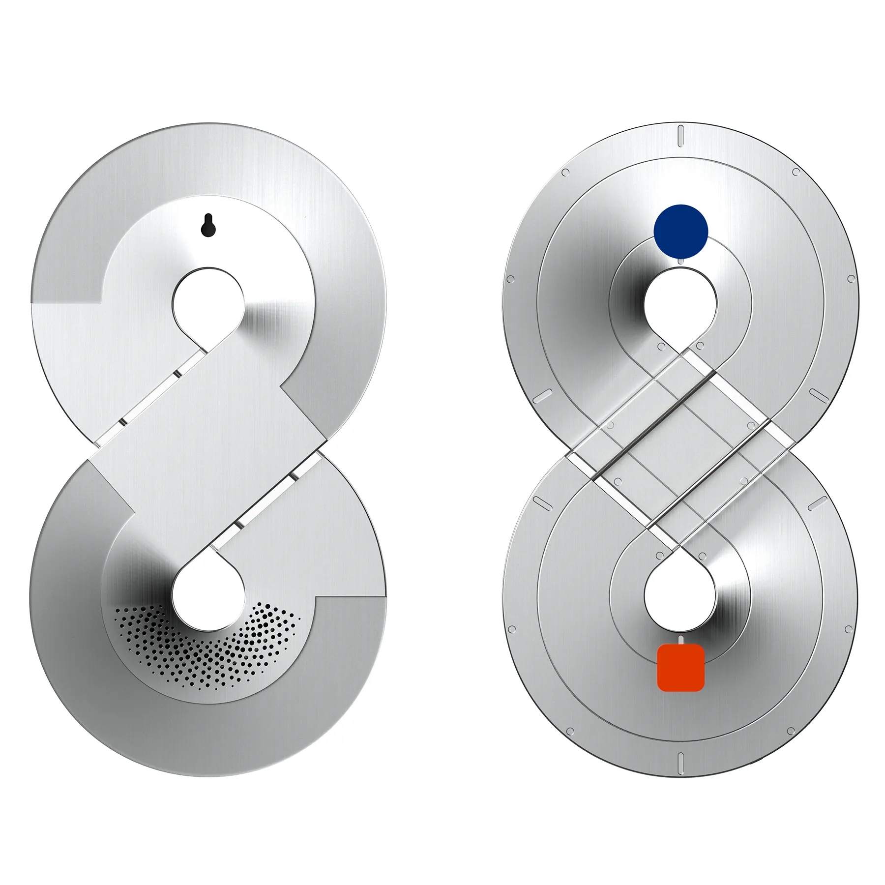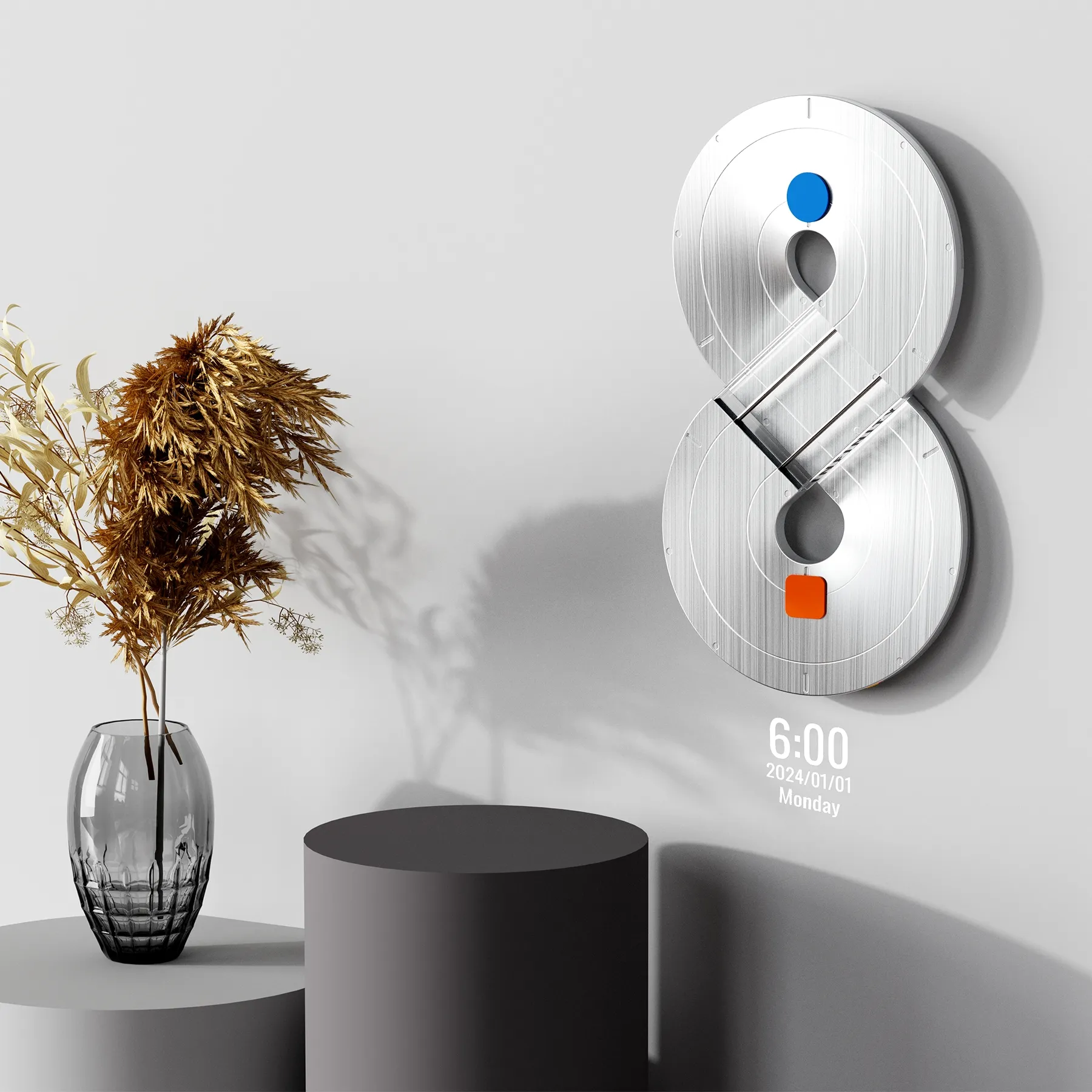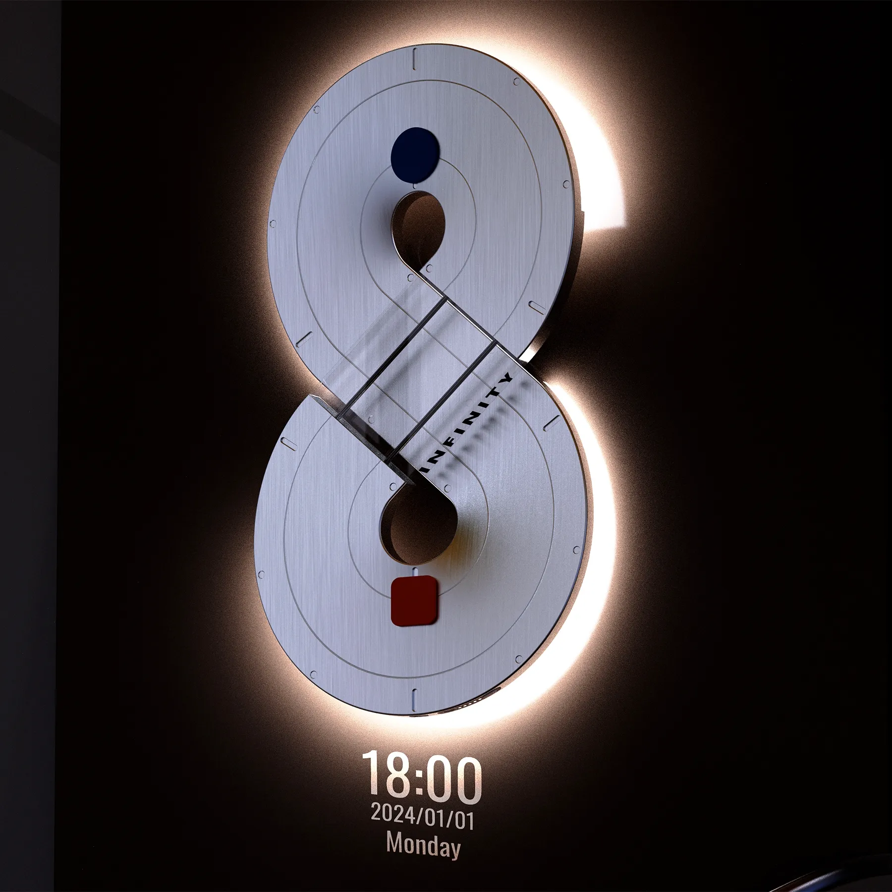 Infinity 时光艺术时钟,灵感源自数学无限符号(∞),是融实用与美学于一体的家居空间艺术装置,更以设计重塑人与时间的情感联结,唤醒人们对时光的珍视;表盘以静谧蓝、灵动橙指针分指时、分针,冷暖碰撞隐喻时间里恒久与鲜活的共生,背部柔光面板可提供柔和夜灯,更以渐变光影将时间流逝具象化,为空间赋予诗意氛围感,同时增设的智能投影功能,能将时间清晰投射于墙面,兼顾艺术感与实用性。