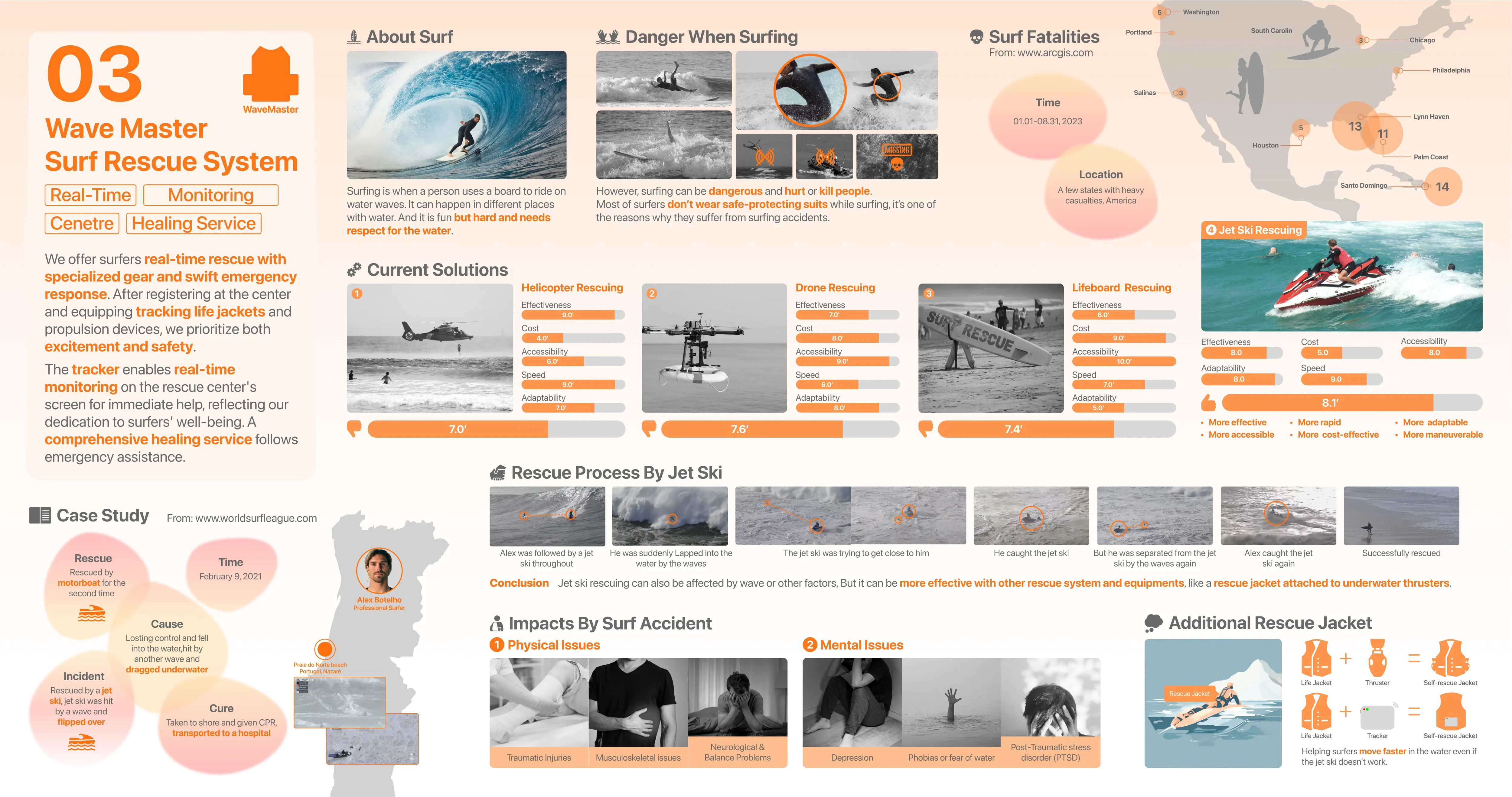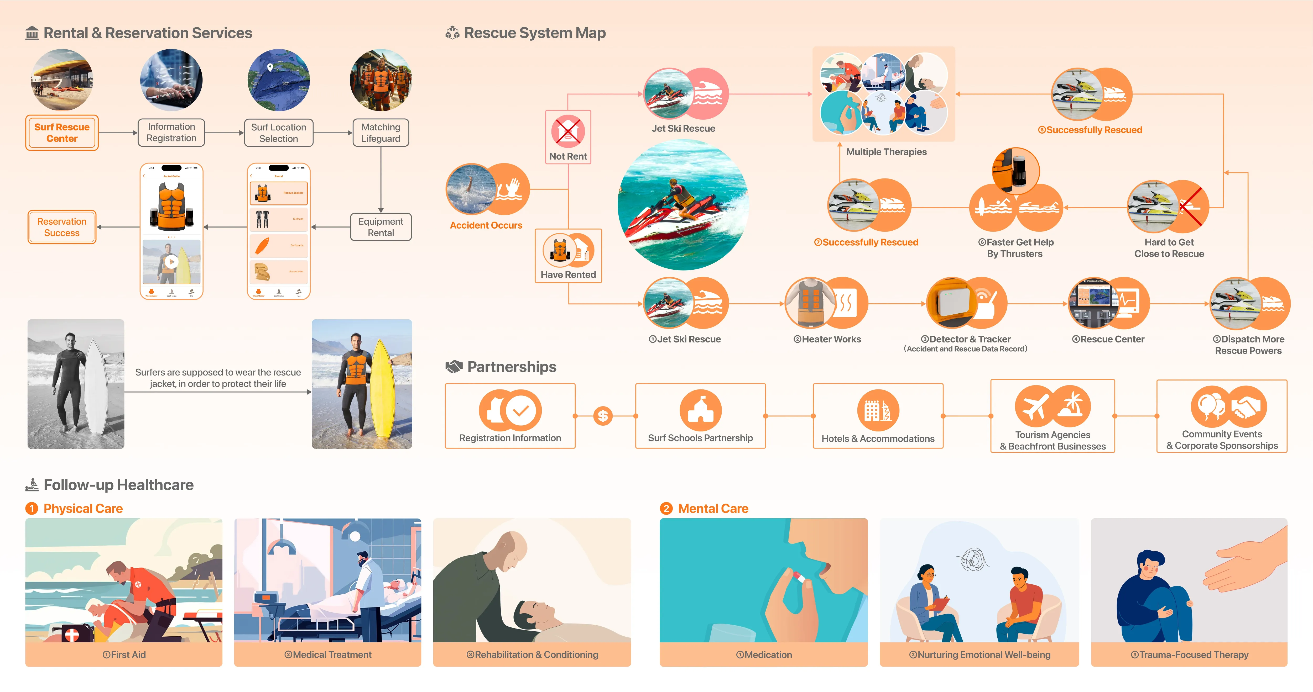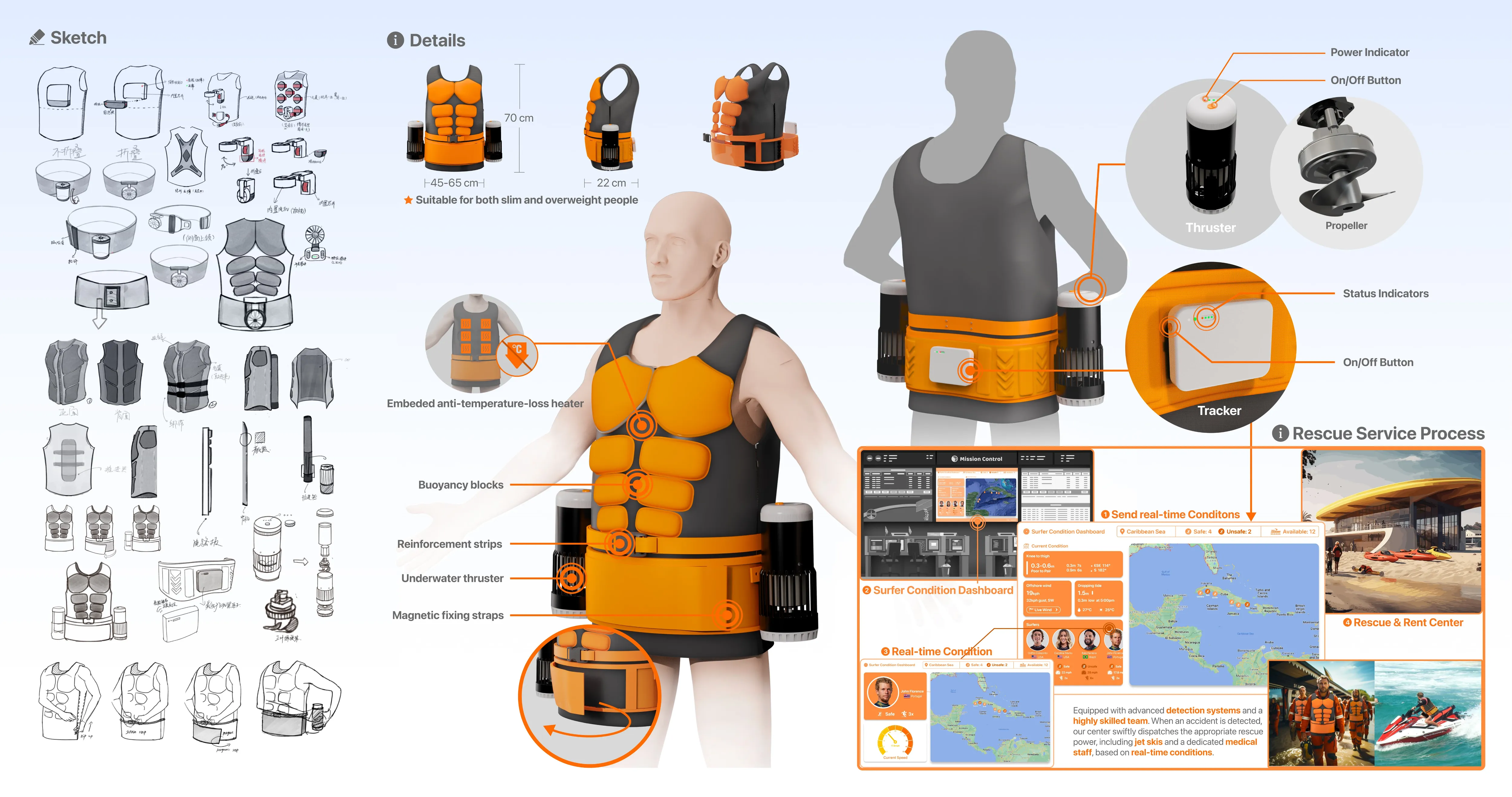 针对冲浪时被洋流卷走、救援滞后、定位困难等安全痛点,以服务设计 + 产品设计为核心,提出集智能可穿戴救援装备、实时定位救援、全流程预警及事故后身心康复于一体的系统化解决方案,通过硬件创新与服务生态联动,提升冲浪遇险自救与救援效率,构建更安全、完整的冲浪运动安全服务体系。