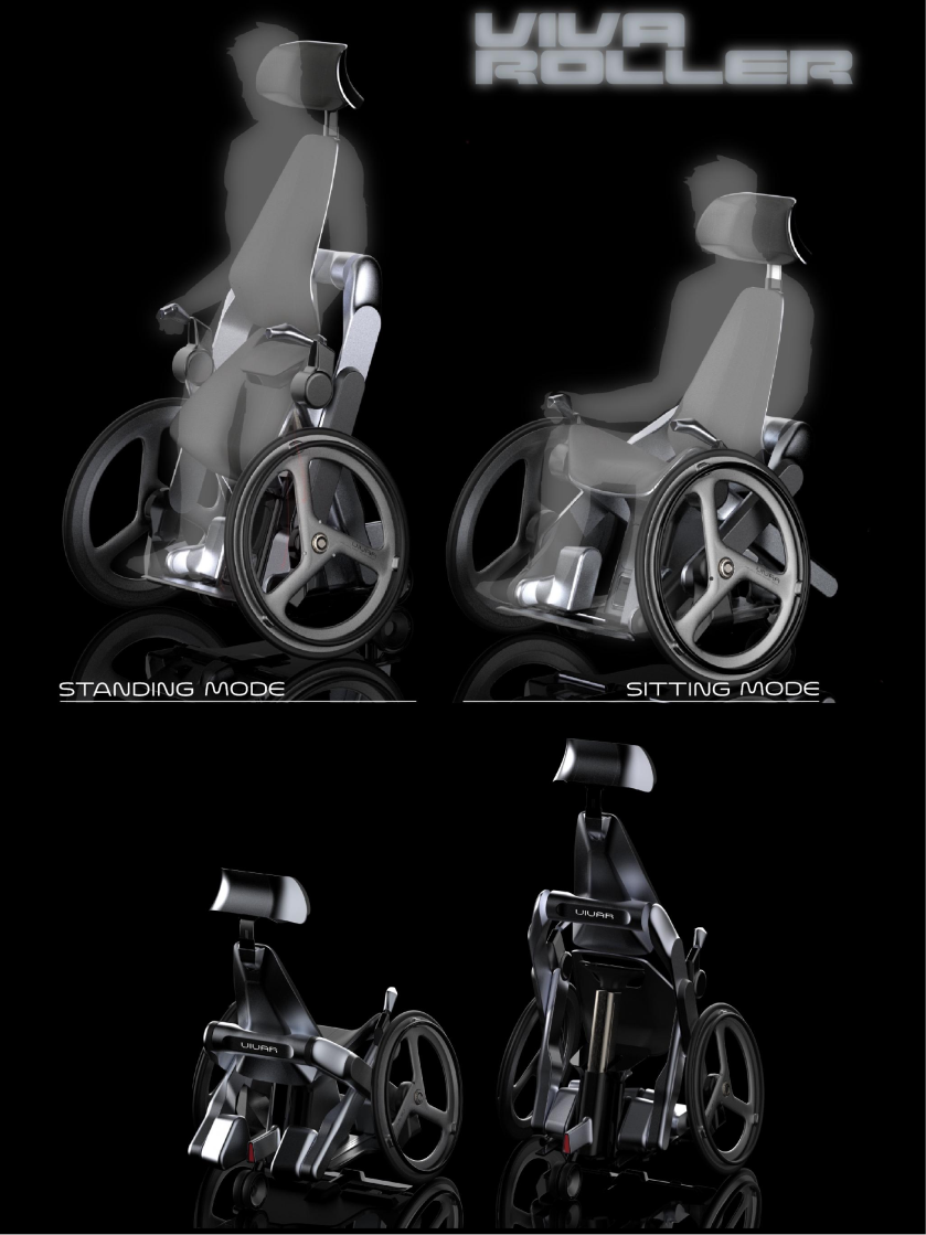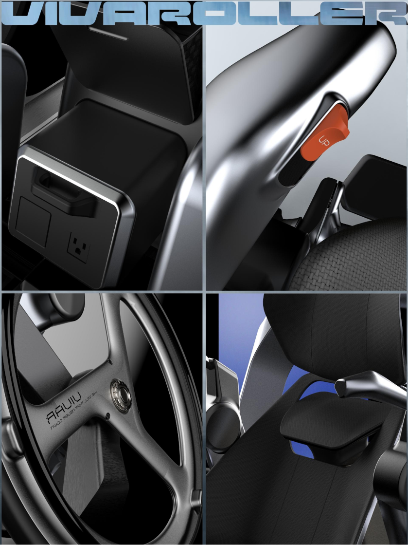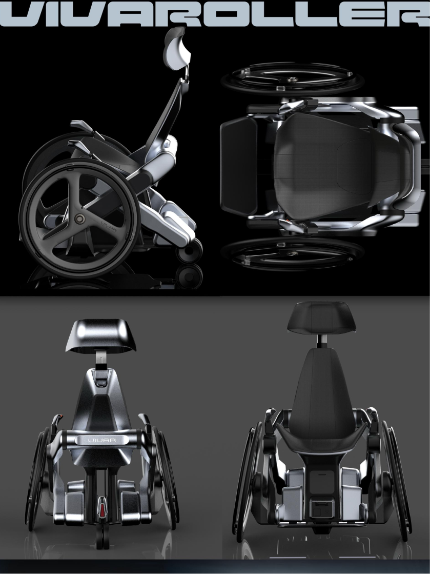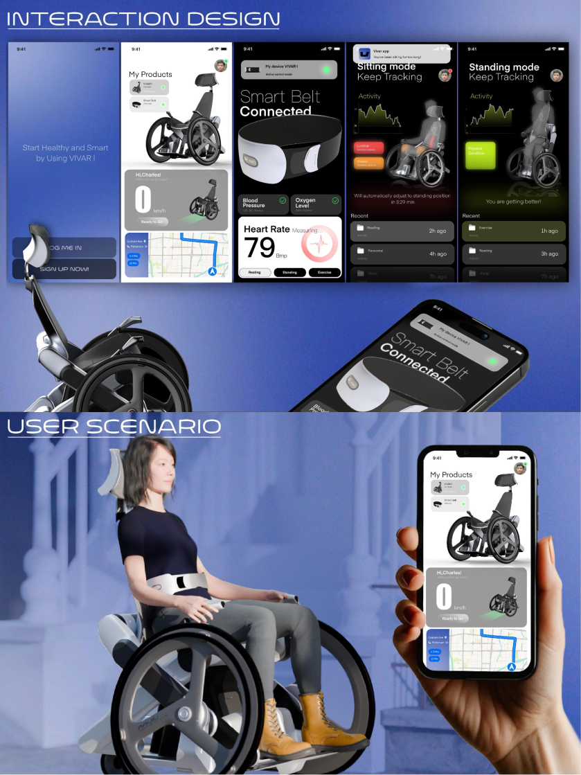 为改善下肢活动障碍者或运动损伤康复者因长期坐轮椅导致的生理衰退与心理困扰,本款“立坐两用”轮椅应运而生。其通过齿条齿轮驱动的“X”形升降结构实现站立与坐姿转换,配合液压支撑杆承托使用者髋部。使用者可通过实体按钮切换模式,或借助智能腰带实现肌肉松弛感应的自动转换。该智能腰带同步实时监测身体数据,并通过移动应用程序呈现。座椅外观融合运动风与科技感,突破传统轮椅设计框架,挑战社会对特殊需求群体的刻板印象。